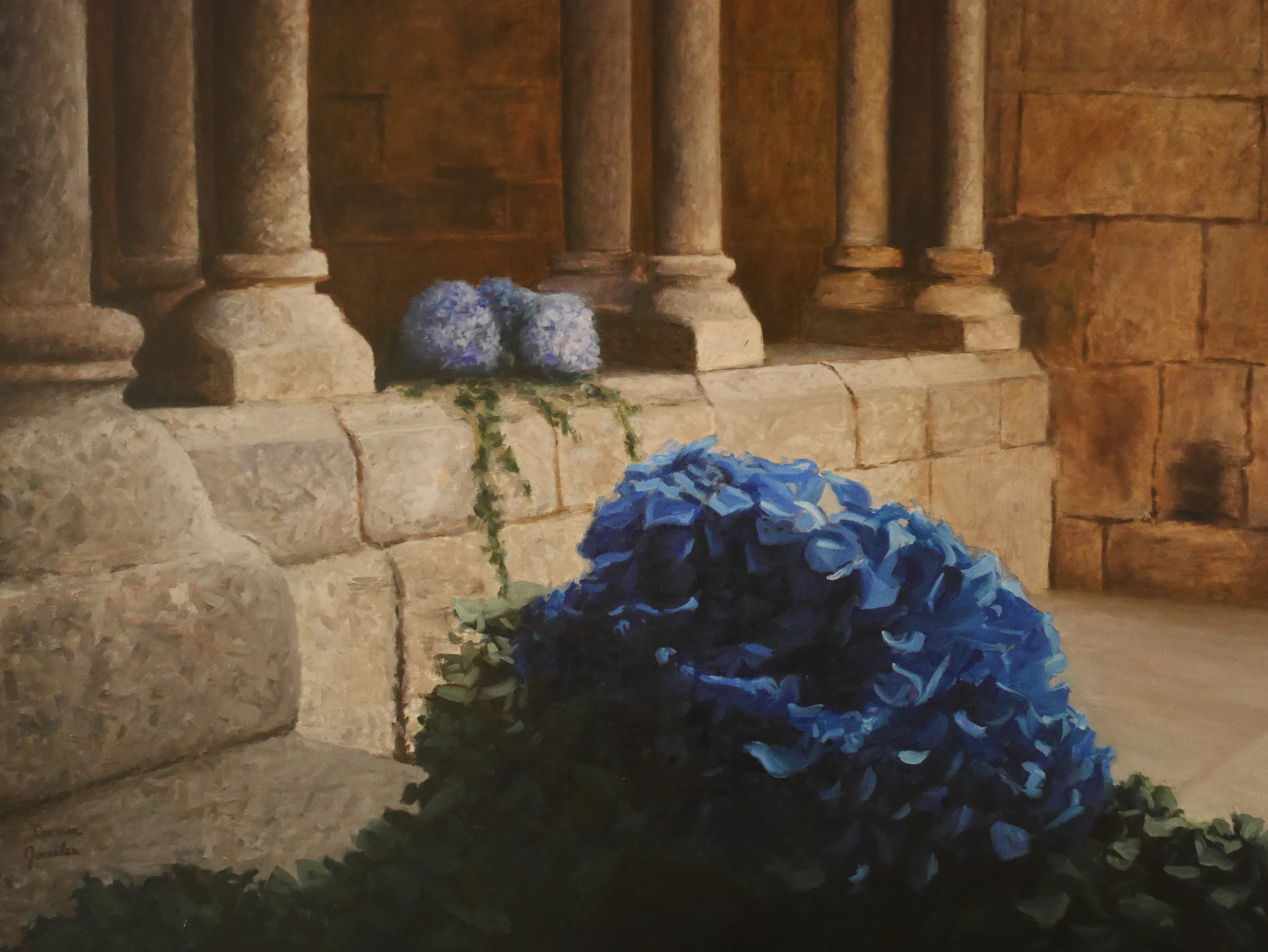 En este cuadro he querido representar el contraste de la naturaleza con la arquitectura. El cuadro está pintando al óleo, gracias al apoyo de Mario Caamaño, pintor y profesor de pintura, y pretende mostrar la belleza efímera de las flores en comparación con la solidez y misterio de la piedra tallada por el hombre.